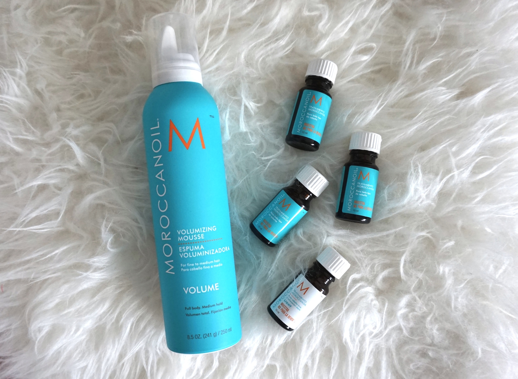 Empiezo con una de mis marcas favoritas para el cuidado del pelo, Moroccanoil. Esta espuma me la aplico en todo el cabello, desde la raíz hasta las puntas para dar volumen, eso sí hay que hacer uso del secador, con aire caliente. Pero antes de la espuma, me estoy poniendo unas gotas de estos aceites increíbles que me dieron de muestra. Los pongo únicamente en las puntas para mantenerlas hidratadas, y ni apelmazan el cabello ni lo dejan aceitoso.