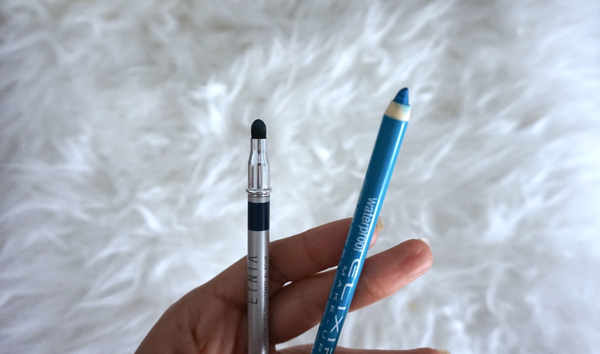 Estos son el azul oscuro de Etnia, con esponjilla en el otro extremos del lápiz y el azul más claro de Elixir. Los dos waterproof. Los suelo utilizar juntos, primero me aplico el claro, y el oscuro lo pongo muy pegado a la base de las pestañas para dar profundidad.