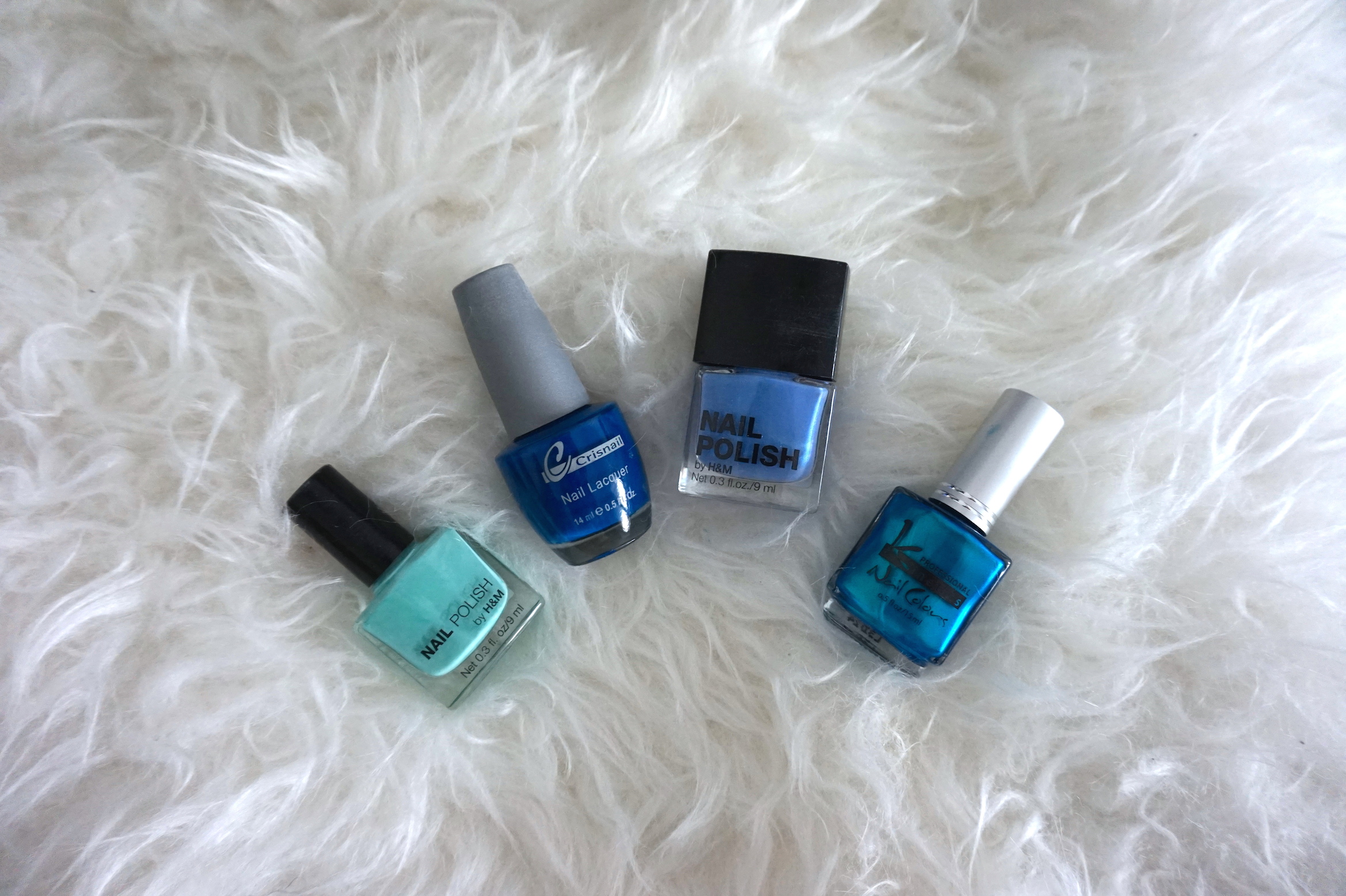 Llega el turno de las uñas! La semana pasada os enseñé lo que se iba a llevar esta primavera-verano, uñas muy variadas y muy coloridas! Así que como la cosa va de azules he recopilado de mi bolsa de lacas de uñas algunos de los que más he utilizado y evidentemente seguiré utilizando esta temporada. Dos de ellos son de H&M de la temporada pasada, uno en un tono azul verdoso pastel, que será de los que más peguen fuerte esta primavera, y el otro es un azul atornasolado que aunque no cubra mucho, queda discreto y bonito. Los otros dos son más fuertes, uno es de Crisnail, un azul eléctrico que me encanta llevarlo cuando visto de negro, me parece que queda muy elegante. Y el otro azul lo compré en la feria de belleza de Barcelona el pasado mes de febrero. Se lo vi a una de las chicas que estaban trabajando en el stand donde los vendían, y me gustó tanto que lo acabé comprando, es que llevo en la foto de abajo. A mi me personalmente encanta.