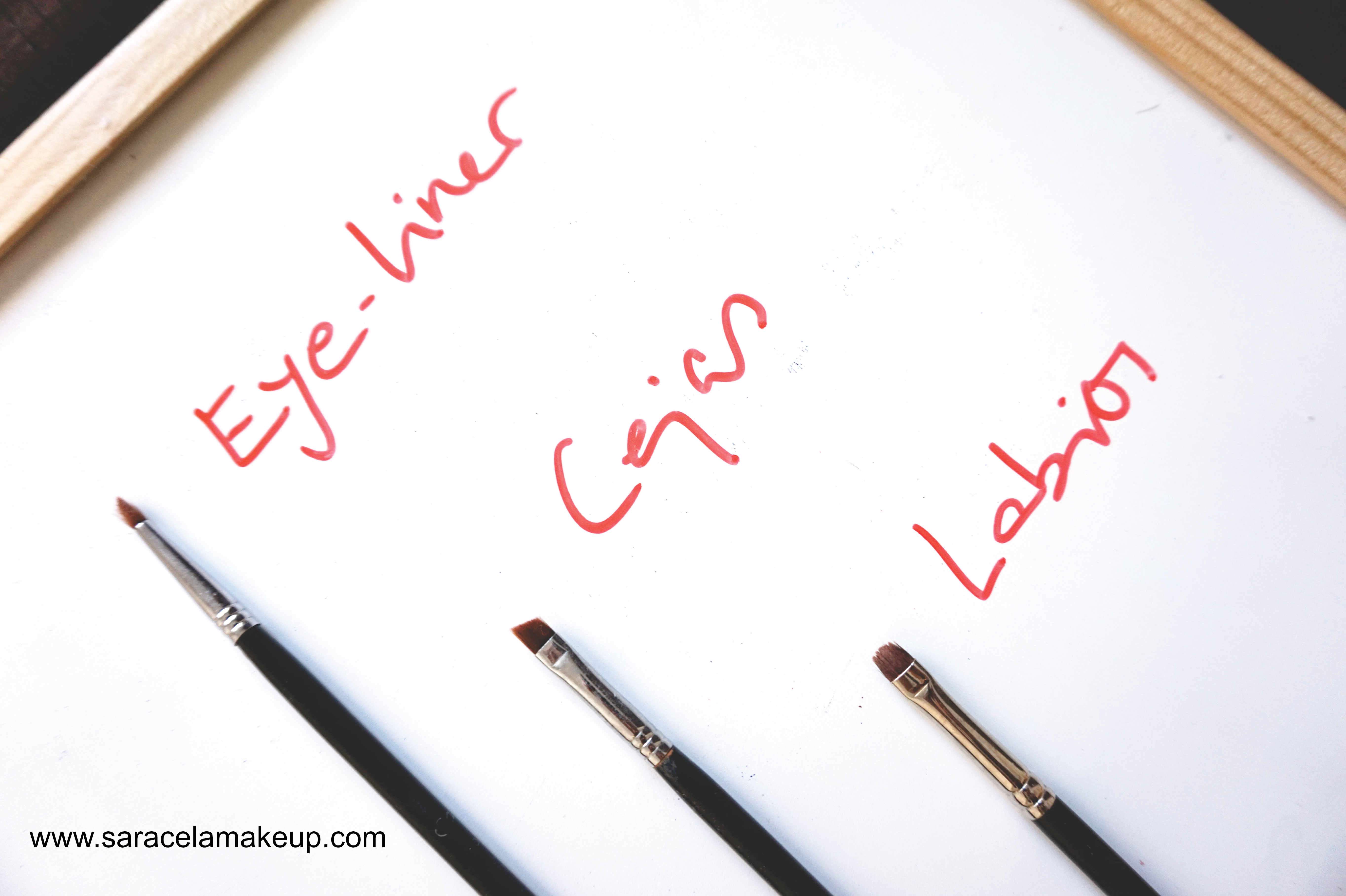 Cejas: Suelen se mejores los de pelo natural y con forma biselada ya que peina ya la vez que maquilla las cejas. Su pelo normalmente es de jabalí, que es mucho más duro que los otros.
